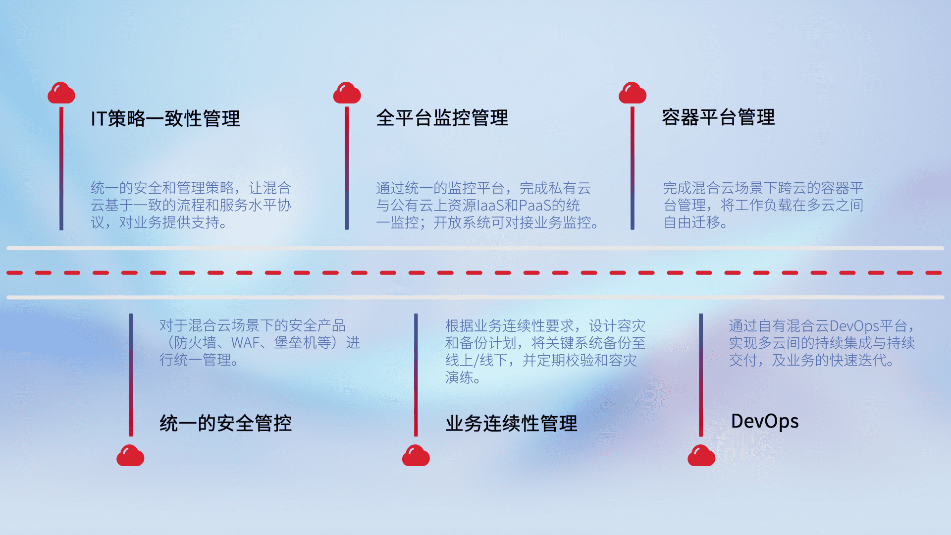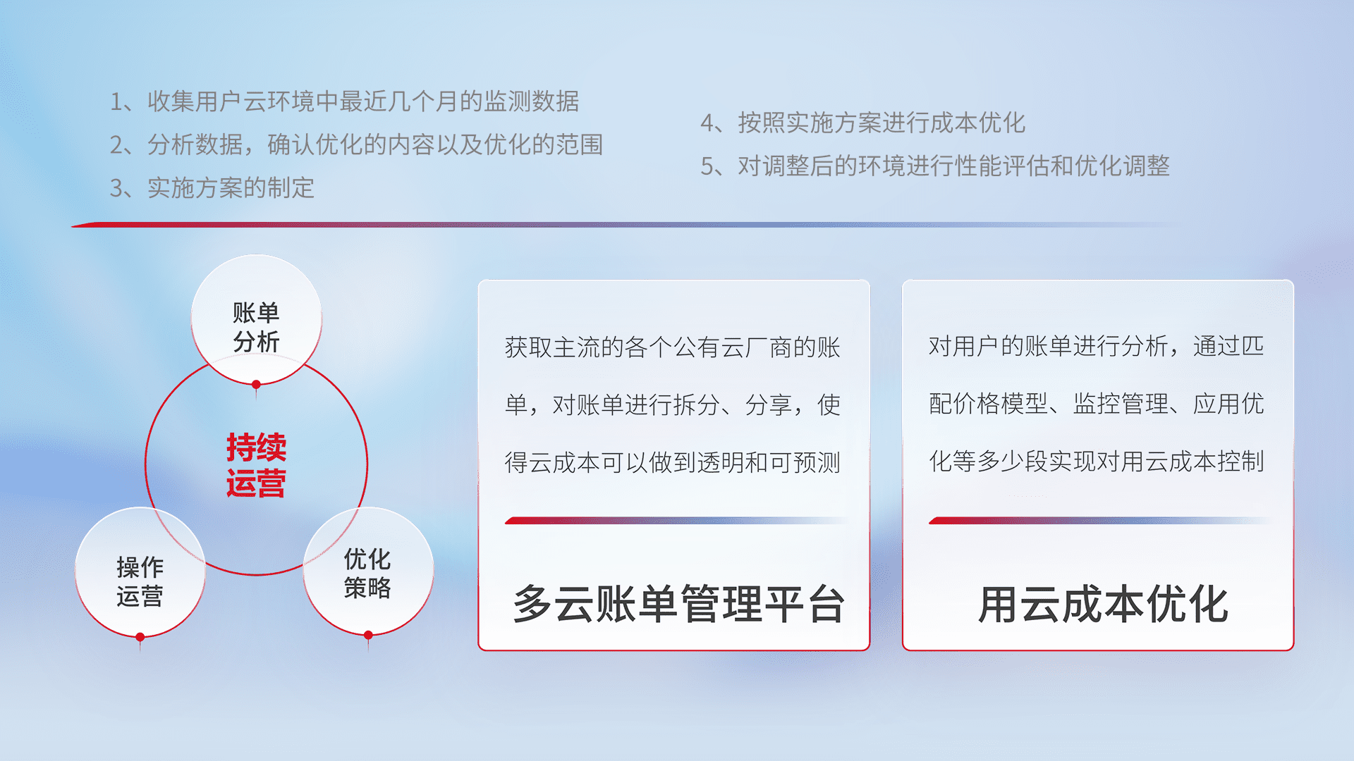 通过多云纳管,,以统一的资源数据模型把客户的云资源进行抽象和封装,,进而实现对多云资源的统一操作,,,,保障云资源管理的可靠性、、、稳定性与可用性。。。量身定制化运维内容,,,,配置、、开发运维、、补丁管理、、、备份、、、、监控、、认证和访问管理、、、审计和日常巡检等,,,保障在用云过程中的可靠度,,稳定度以及高可用率。。。