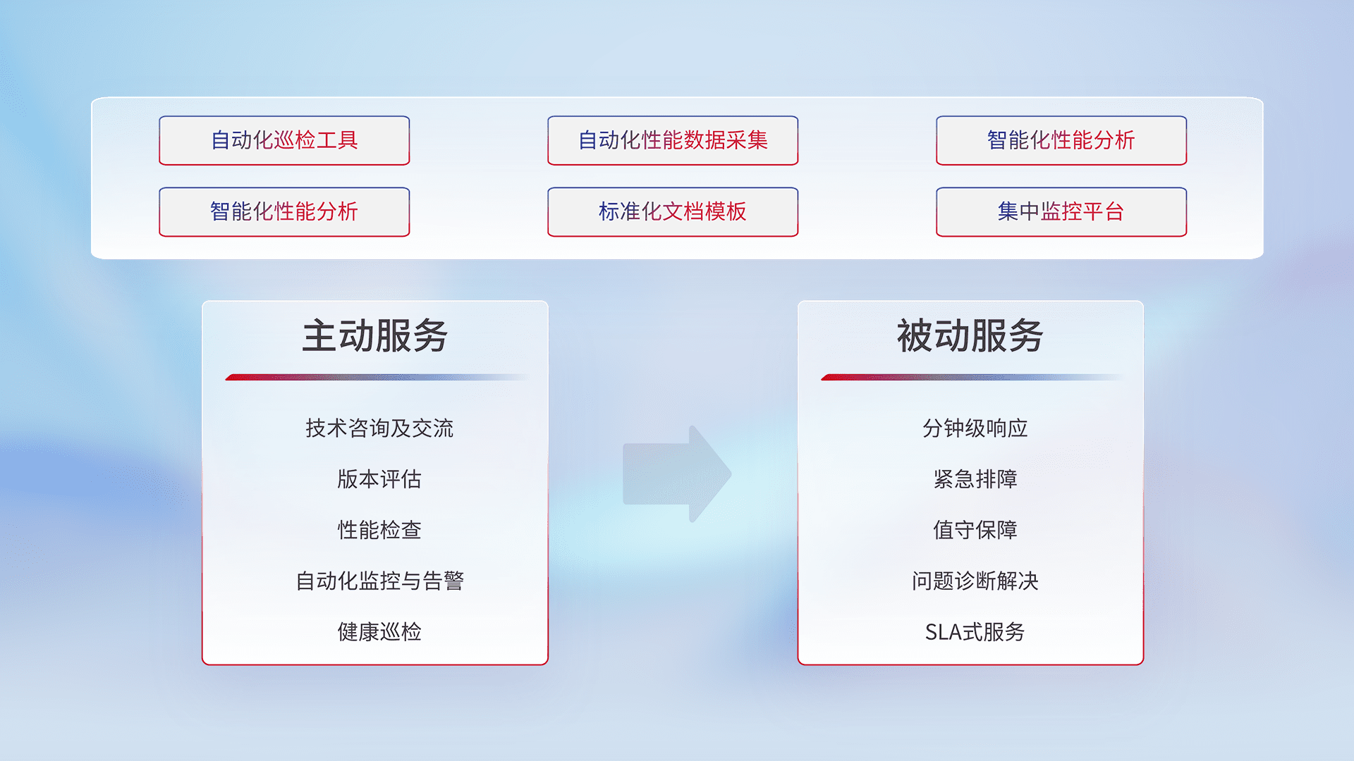 智能化工具和标准化文档,,,,保障服务质量,,,提供主动服务(包含技术咨询、、、版本评估、、、性能检查、、、、自动化监控与告警、、、健康巡检)和被动服务包含(分钟级响应、、、、紧急排障、、、值守保障、、问题诊断解决、、SLA服务)。。。
