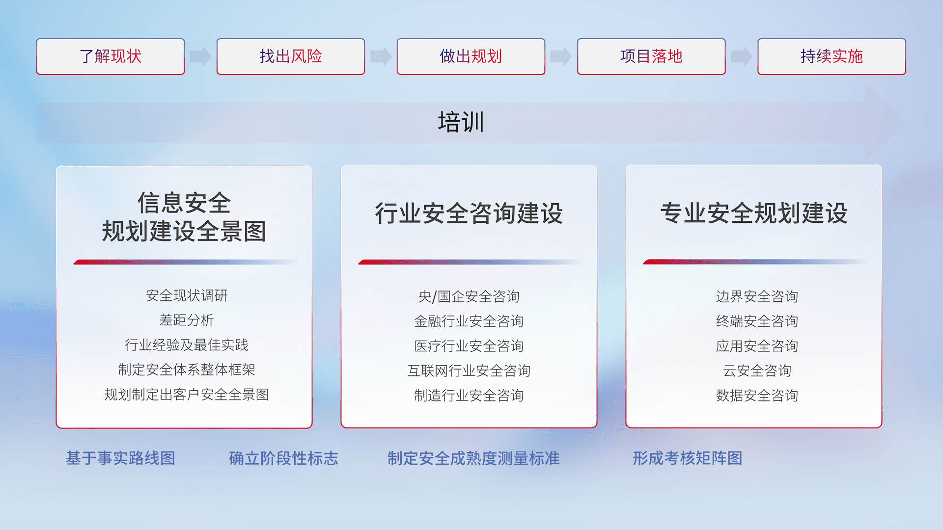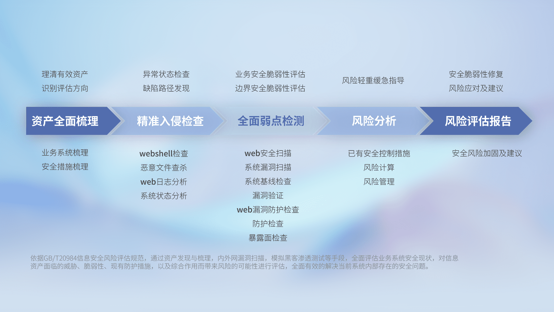 针对客户行业特性,,,以专业的安全服务+多厂商联合解决方案提供专属的一站式安全管理服务,,,帮助客户全面感知网络空间威胁,,,,基于识别、、、检测、、分析、、、、防护、、监测、、、响应的服务理论模型,,从方案咨询、、集成交付、、、评估验证、、优化加固、、运维运营,,,,致力于为客户提供完整的闭环管理式安全服务。。。。以实战经验为客户打造高抵御风险的安全体系,,帮助客户发现威胁、、对抗威胁、、、处置威胁,,不断积累安全对抗能力,,,,持续保障数字化安全。。。